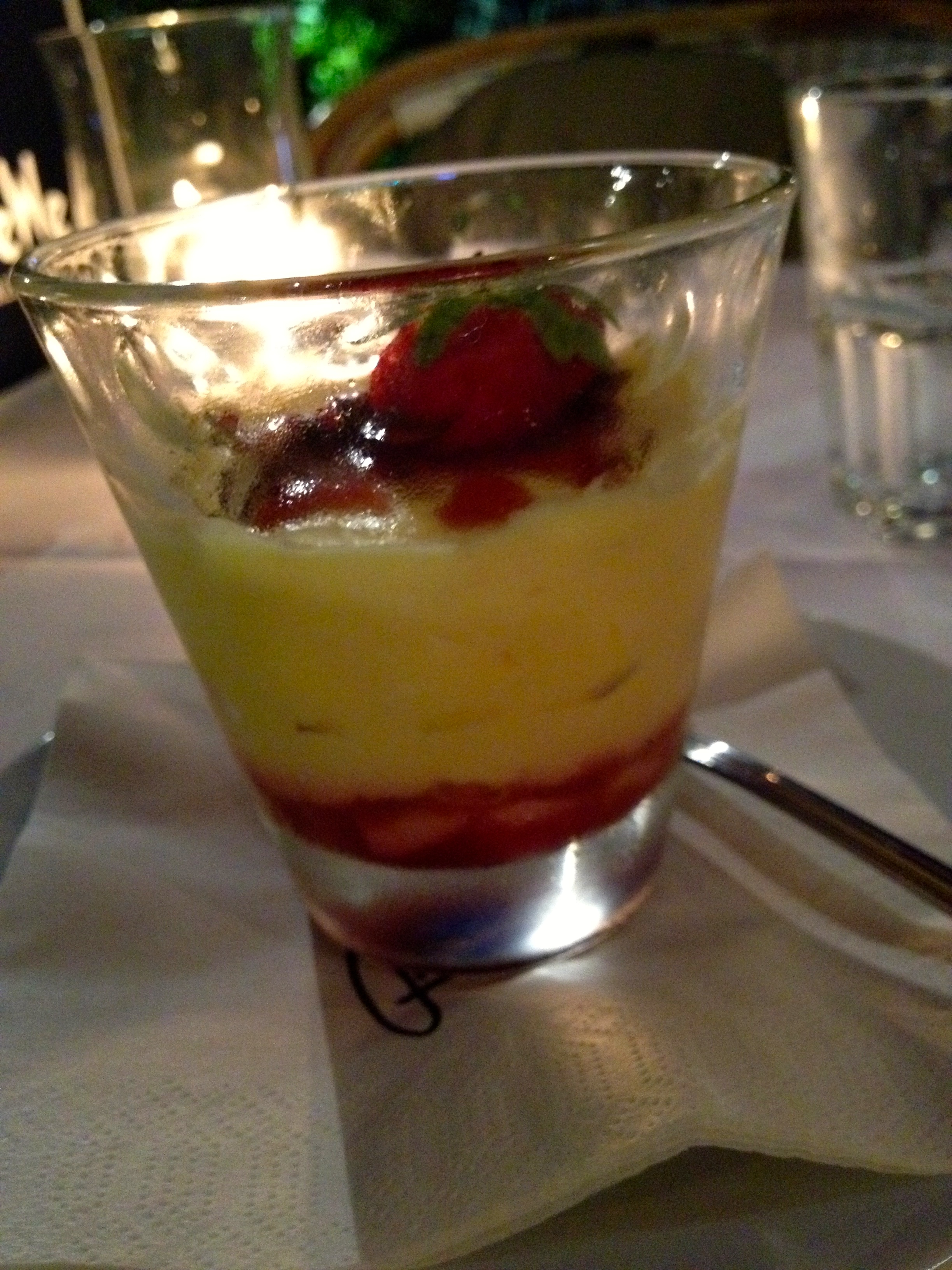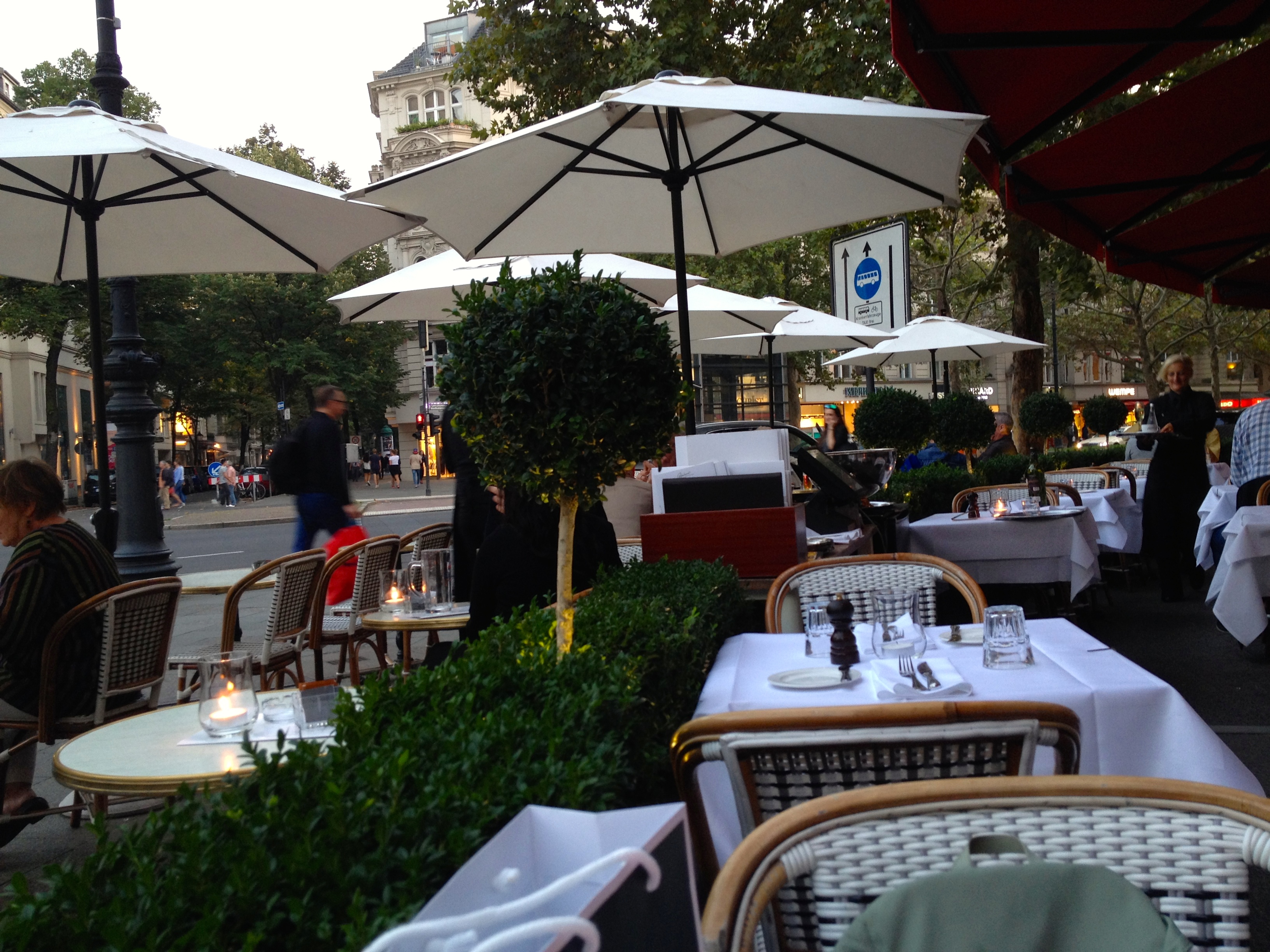 Ended the day with a great dinner at an outdoor corner café – one of the best features of Europe. I had a very drinkable sparkling wine (I’ve already forgotten the name but I did post it on Facebook), a good salad, a fantastic sweet and sour pumpkin risotto and a Berlin traditional vanilla dessert with raspberries, which was also very good. A lovely ending to a lovely day.