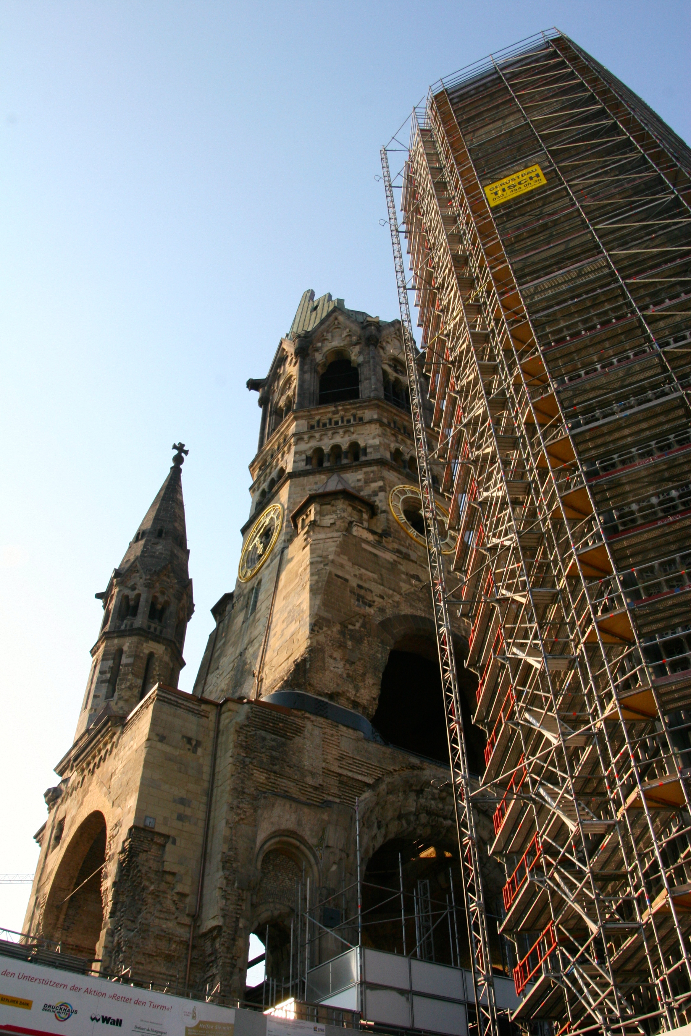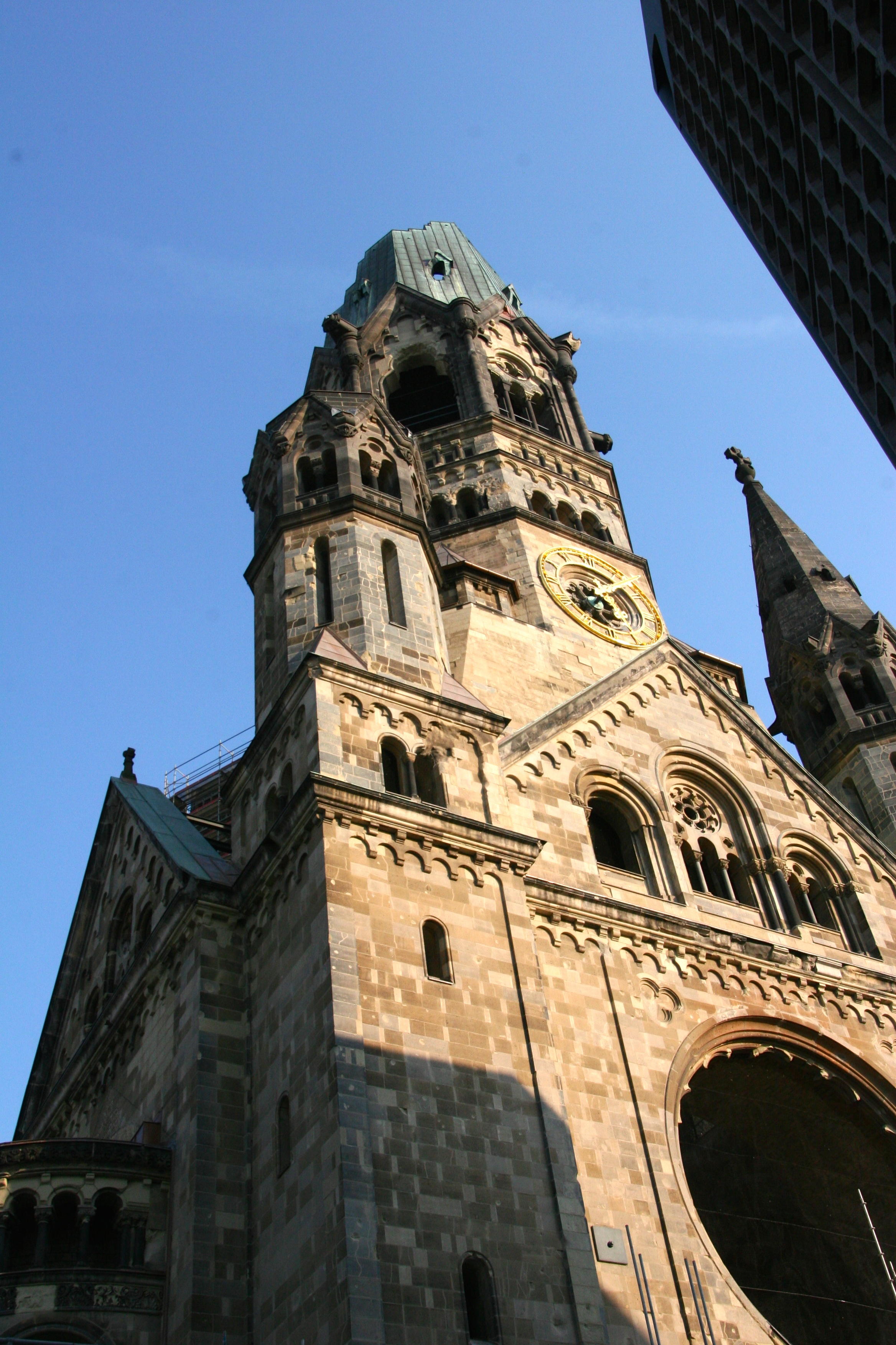 Back in the hotel neighborhood, I looked in briefly at the Kaiser Wilhelm Gedachtniskirche, billed as a bombed-out tower serving as an anti-war memorial. (Bombed out during World War Two, the tower is now being renovated in some way so it’s under cover.) The church is striking, however, in the midst of all the modern buildings around it.