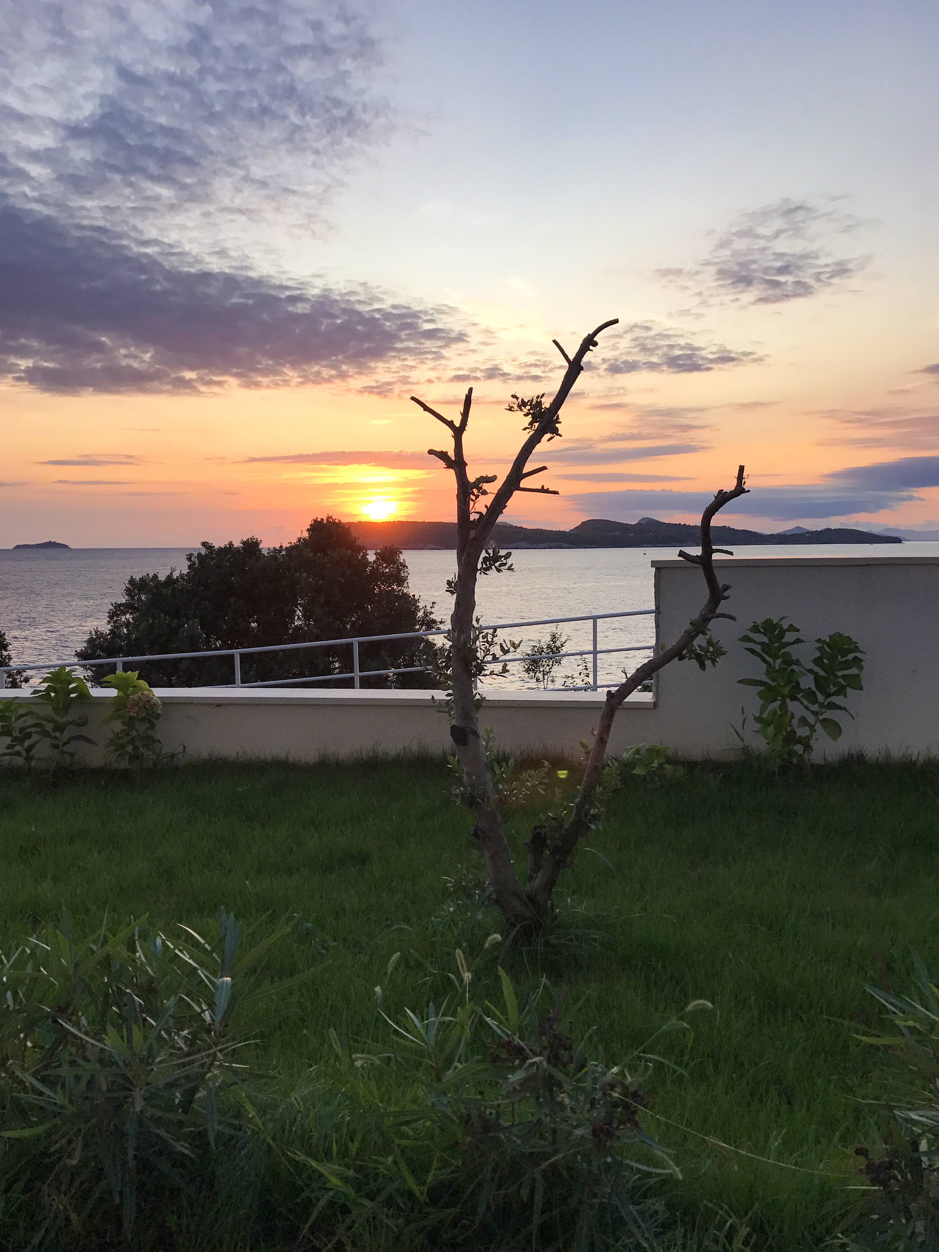 Sunsets here have been much more colorful after the sun is actually set. This pic is representative of the actual sunset: pretty; nice; not necessarily fabulous or stunning. By the way, this is my AIS view from the chair on my balcony. π