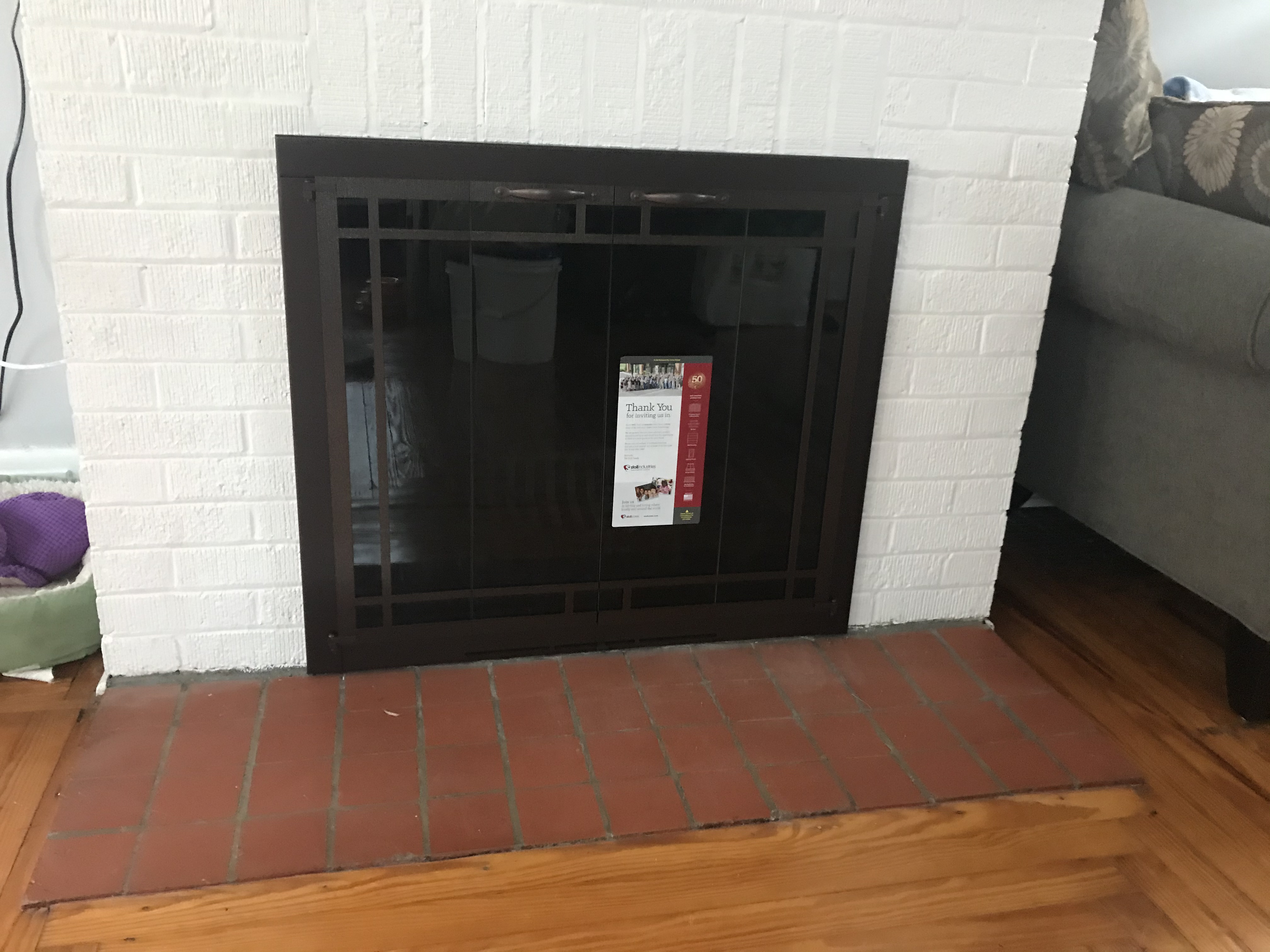 A simple picture, shot immediately after installation. Once accessorized, it “popped” as much as I expected it would. I didn’t even have to repaint the red bricks like I feared I might. It was an added bonus to discover that the manufacturer, Stoll Industries, was an American industry; my new fireplace door was made in the states!
