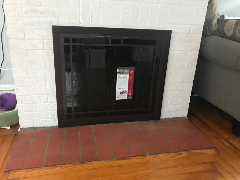 Besides the so-called fixes, my bigger desire, as noted above was to improve the aesthetic; the bright gold, heavily-chipped door, the torn spark screen. I found a fireplace store (Hearthside Fireplace and Patio) within 4 miles of my house. Visiting one evening just before they closed, I quickly “designed” a new fireplace door from their showroom options. To my excitement, they promised to install the new door prior to Christmas and delivered as promised. I had a fire burning in the fireplace on Christmas day, a bright spot in an otherwise less-than-bright year.