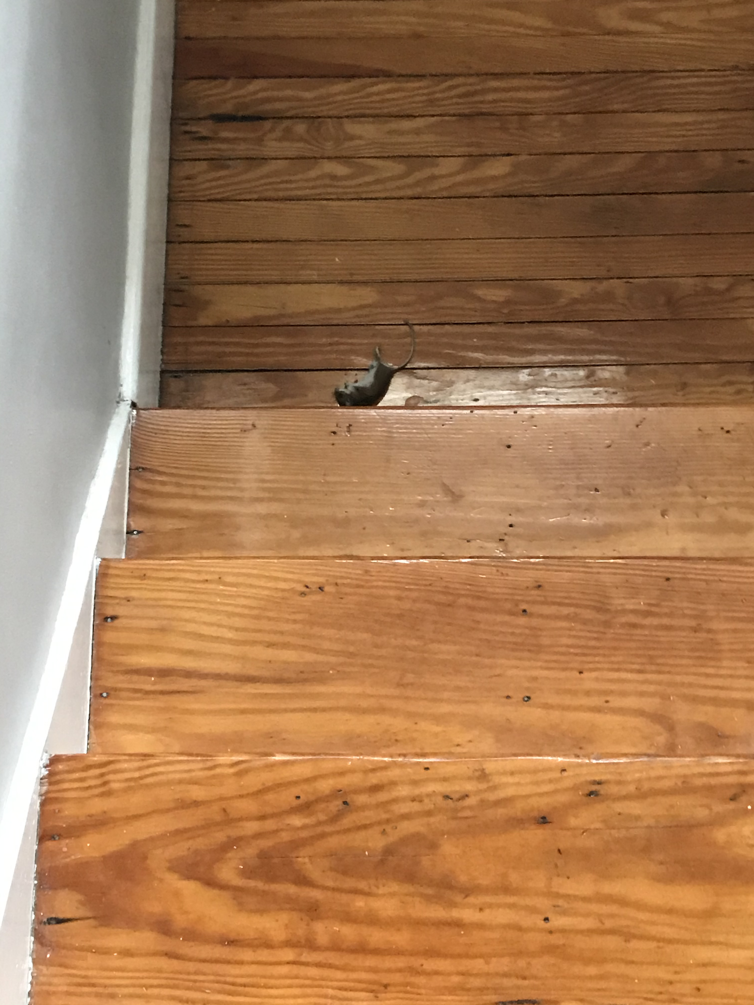 8:00 a.m. – I head back toward the bathroom, walking slowly and cautiously. The cat is no longer there, neither is the dead or half-dead thing. Proceeding into the bathroom, I put my contacts in and feel somewhat better, knowing I will not accidentally step on a dead or half-dead mouse. I proceed with my morning routine, until I hear another “thunk.” I see Fitz coming out of the bedroom, looking down the stairs. I come outside and peak around the corner to see an apparently-dead mouse on the landing 5 stairs down. It looks dead; I am hopeful. A dead mouse is still a problem but not as much as a half-dead one.