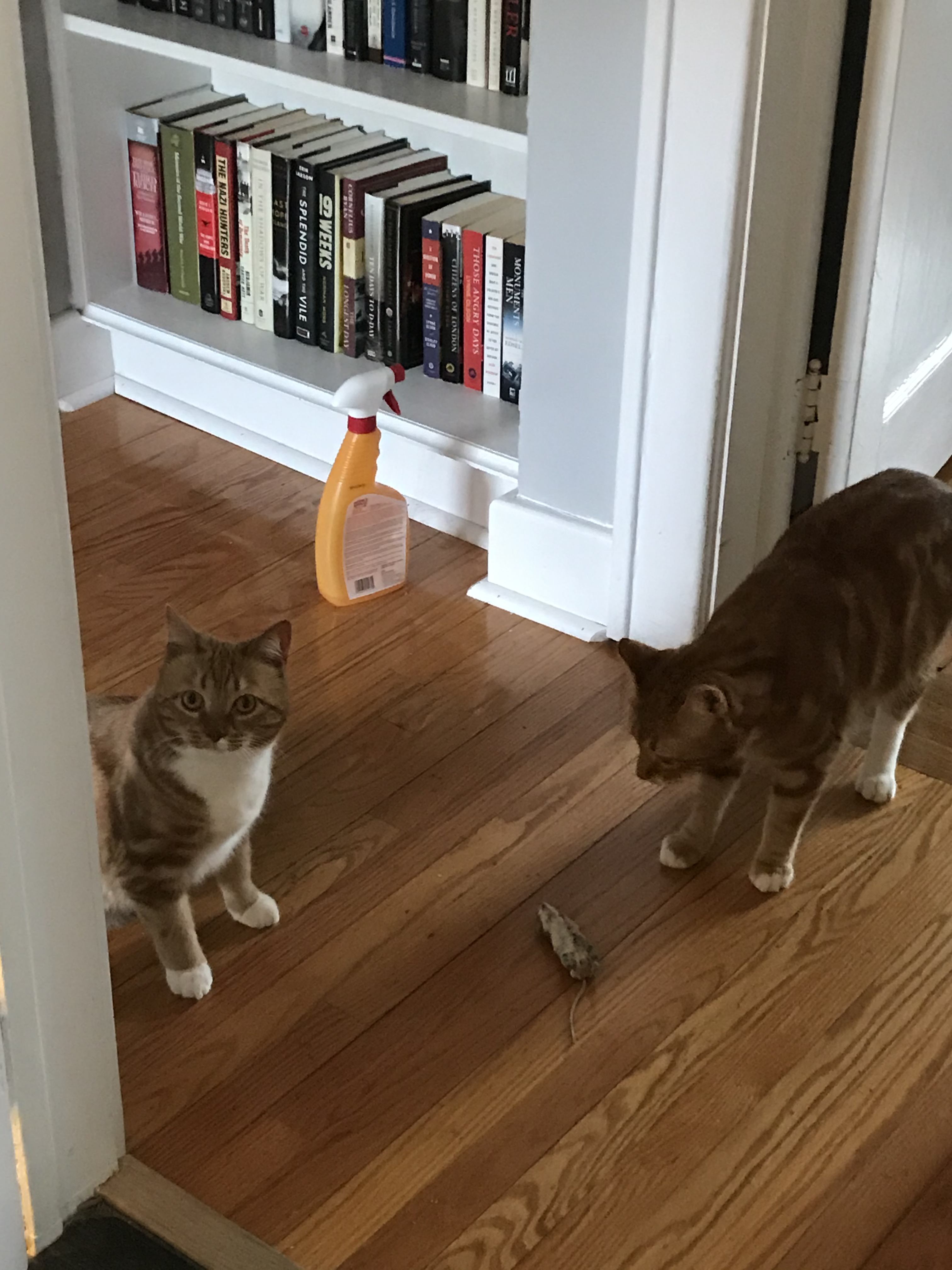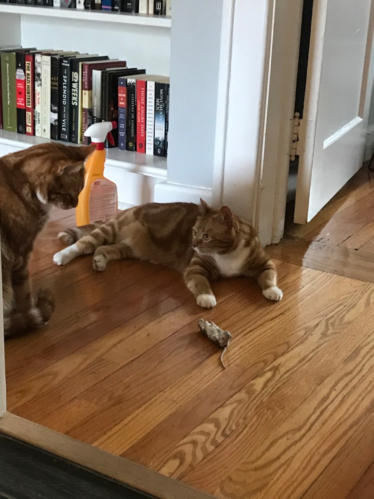 Feeling relieved but still traumatized, I continue getting ready. Ella appears again outside the bathroom door, dropping the mouse on the floor. I back up against the shower wall, as far away from Ella and the mouse as possible while still able to watch. Ella sits proudly, watching her prize. Fitz checks it out from time to time, Strong and independent though I am, I continue to shriek like the girliest-girl as I watch Ella play with this big, chunky mouse, flipping it about with abandon. I video and shriek, and beg Ella to stop playing with it to no avail