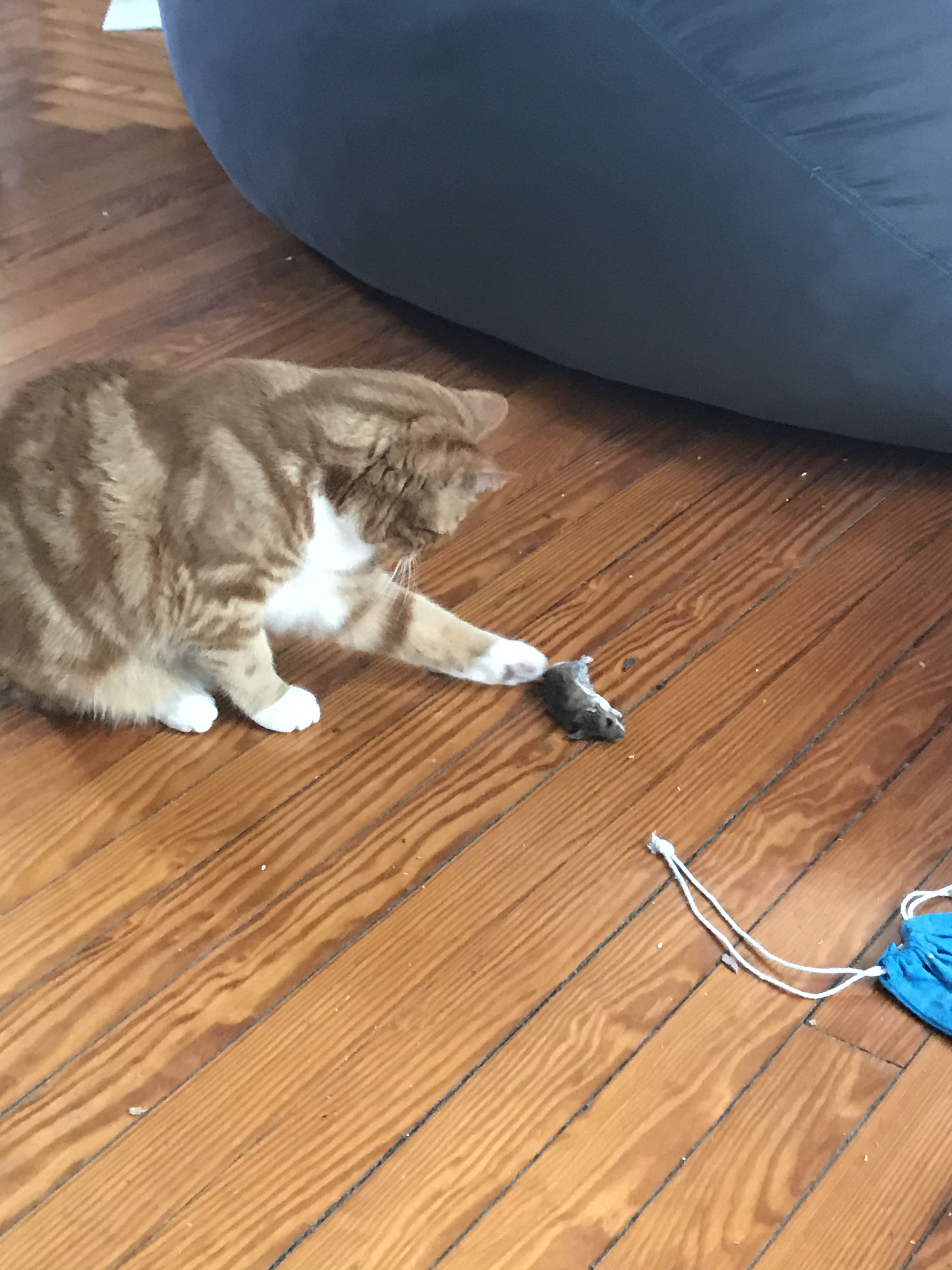 Now in the living room, Ella keeps playing with the disgusting thing. She sits on it, she tosses it around, she bites at it, gross. I see a splotch of blood right next to where Ella has the mouse, gross again!