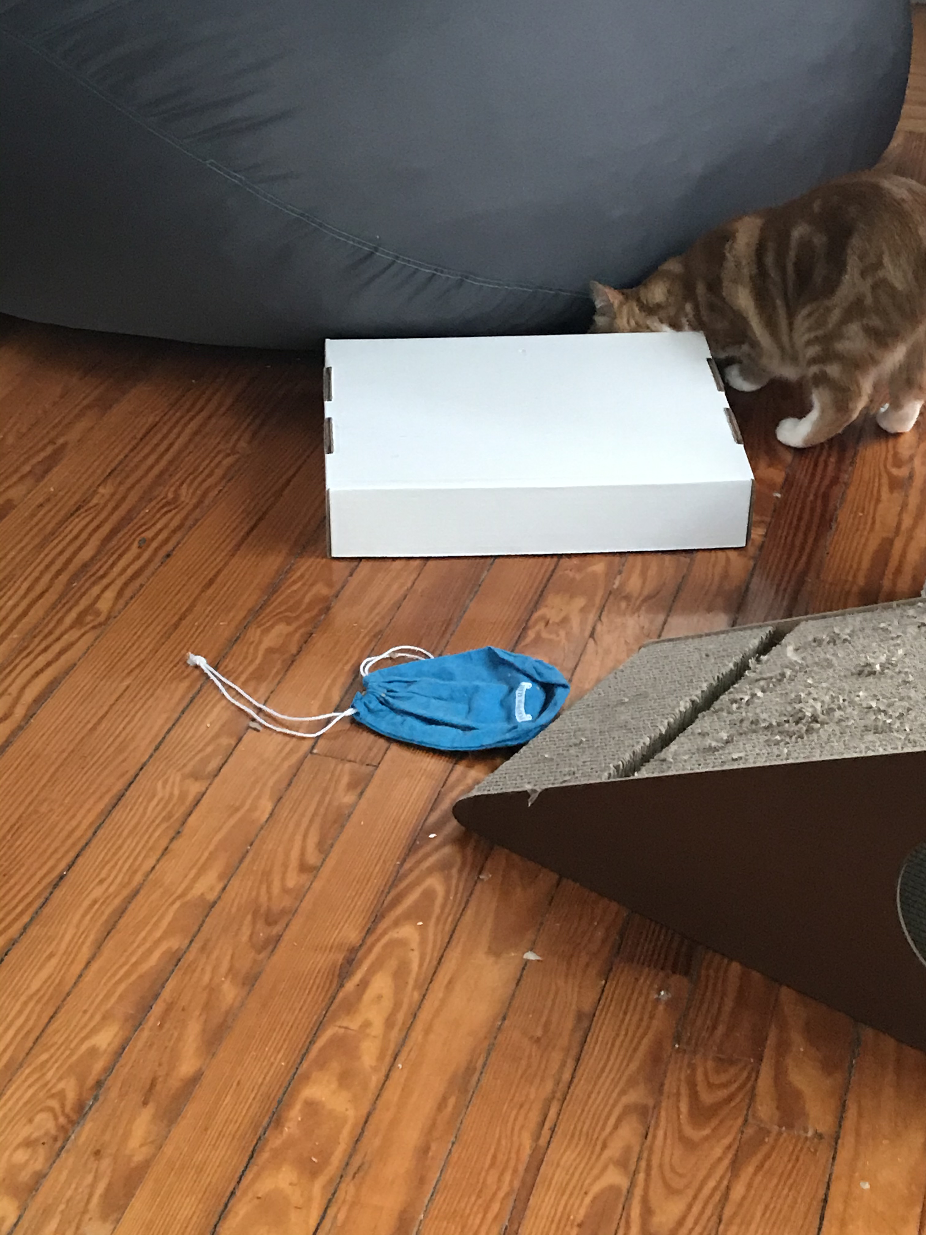 It’s almost time to leave w/ Fitz for his vet appointment. Concerned about Ella taking a bite out of that mouse while I’m gone, I cover it with the lid from a nearby box.