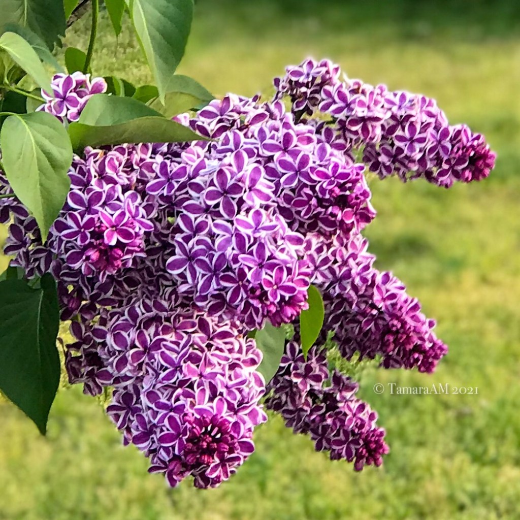 The neighborhood surprise of the week, a beautiful white-edged purple lilac bush.
