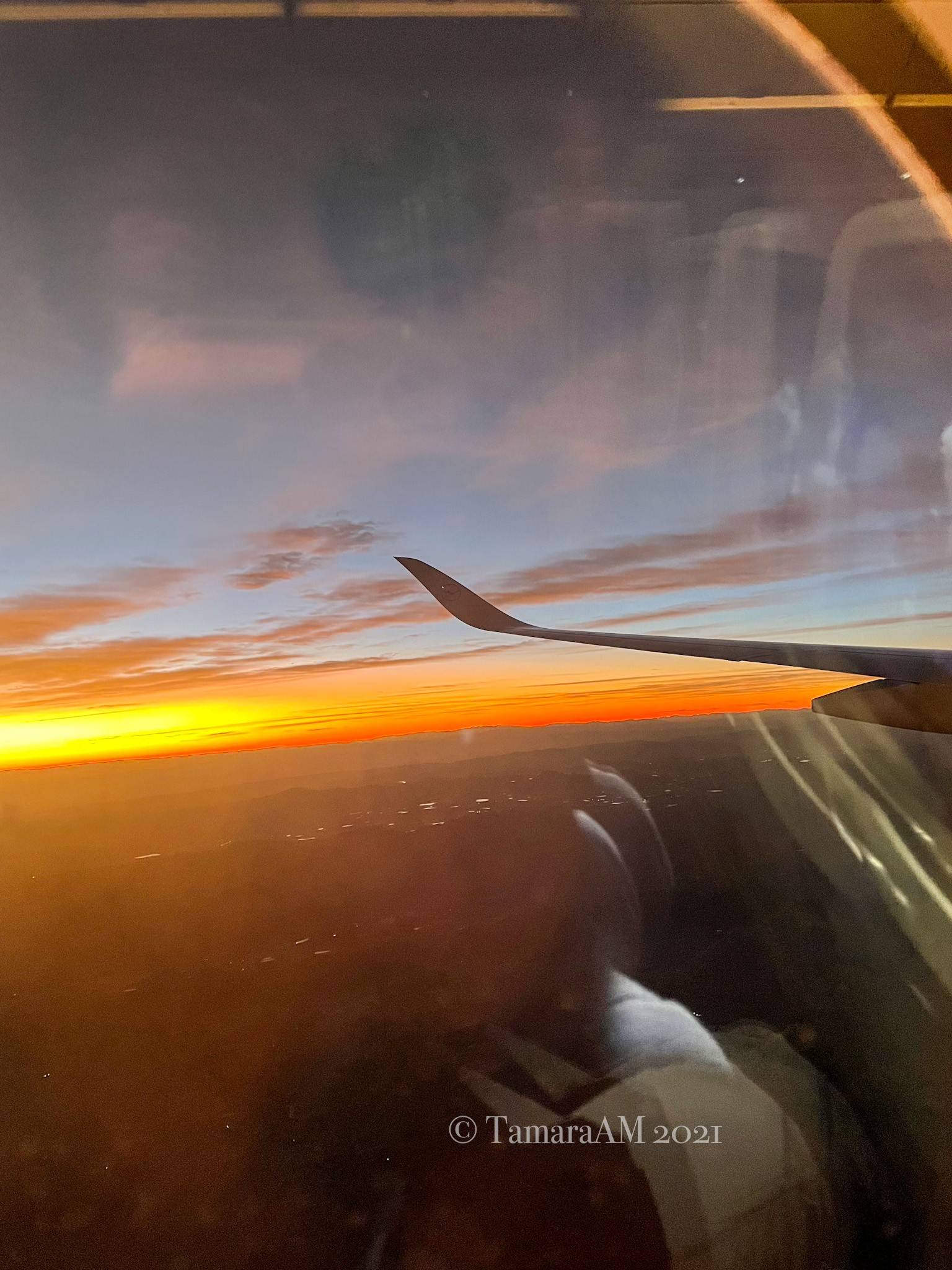 The sun was coming up over the horizon as we breakfasted on the plane. As someone who is definitely not a morning person, I had to snap a reflection-filled picture of the sunrise through the plane window. Obligatory picture here…