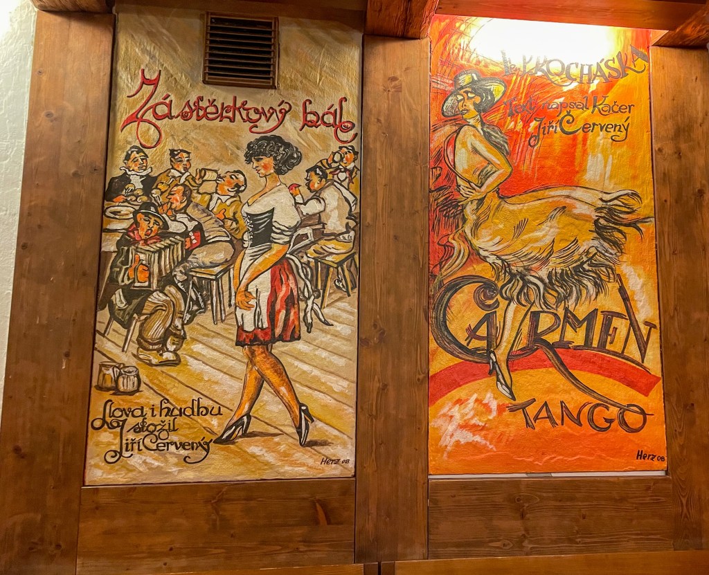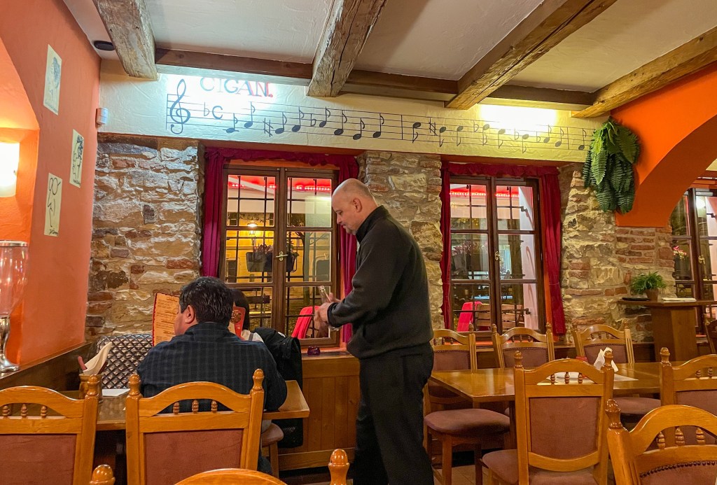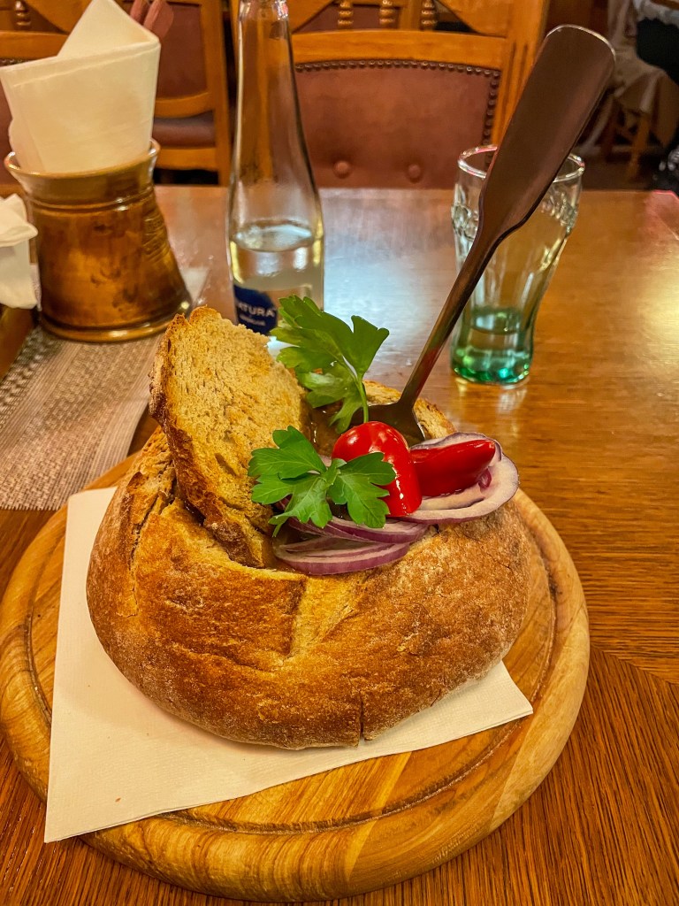 Early Sunday evening after an enjoyable but long day of exploring around Prague (from the Jewish Quarter, to the river bank, across the Charles Bridge to Kampa Island, down to the Strelecky Ostrov and back), I was enticed by the sign outside this restaurant advertising beef chili goulash served in a warm bread bowl.