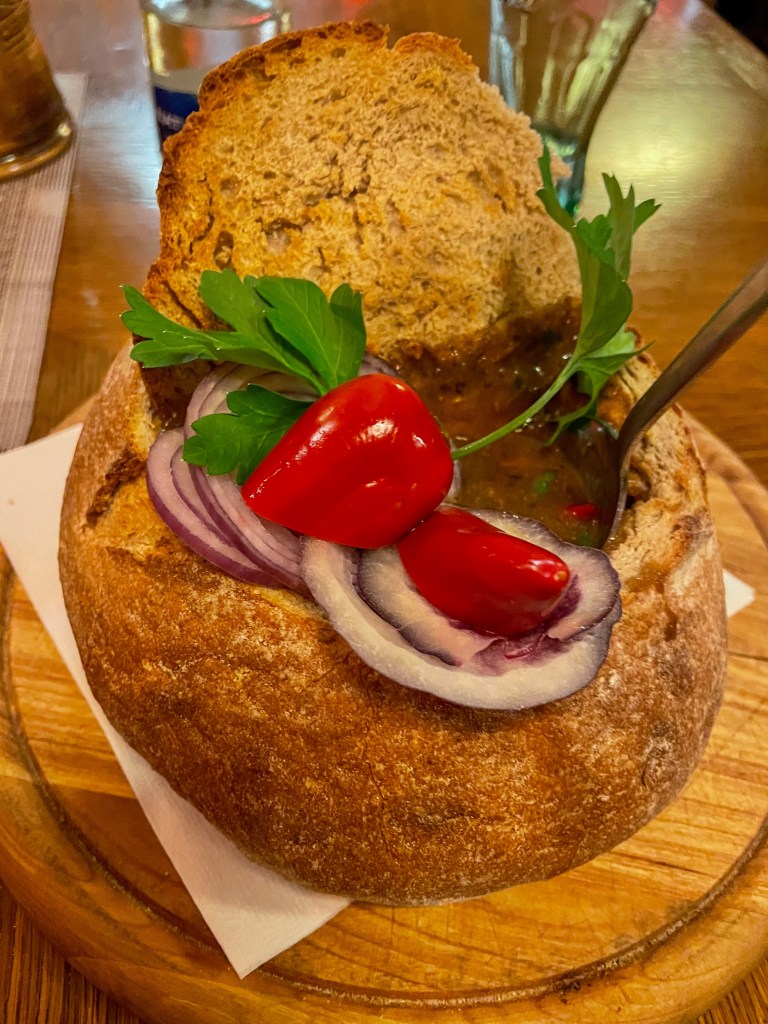Though I looked at the menu, I went with the dish that lured me in, the beef chili goulash served in a warm bread bowl. It was utterly delicious.