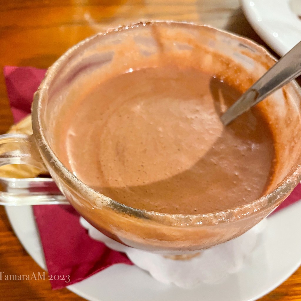It started with my visit to Choco Cafe, a place I’d seen Saturday on my private tour with Dana. My gosh, the cafe goes all out for chocolate! It has a menu that lets you choose the origin of the cocoa beans used to make your hot chocolate. A big fan but never claiming to be a connoisseur, I went with dark chocolate (as opposed to milk, or white; isn’t white milk? See, not a connoisseur) topped with sea salt and whipped crème. But the menu literally had two pages devoted to various locations the beans were sourced from. I also ordered original Horice Rolls (described as original cinnamon rolls with whipped cream and chocolate). While delicious, they were not what I expected (more of a crepe); clearly the warm up act and not the main event, lol.