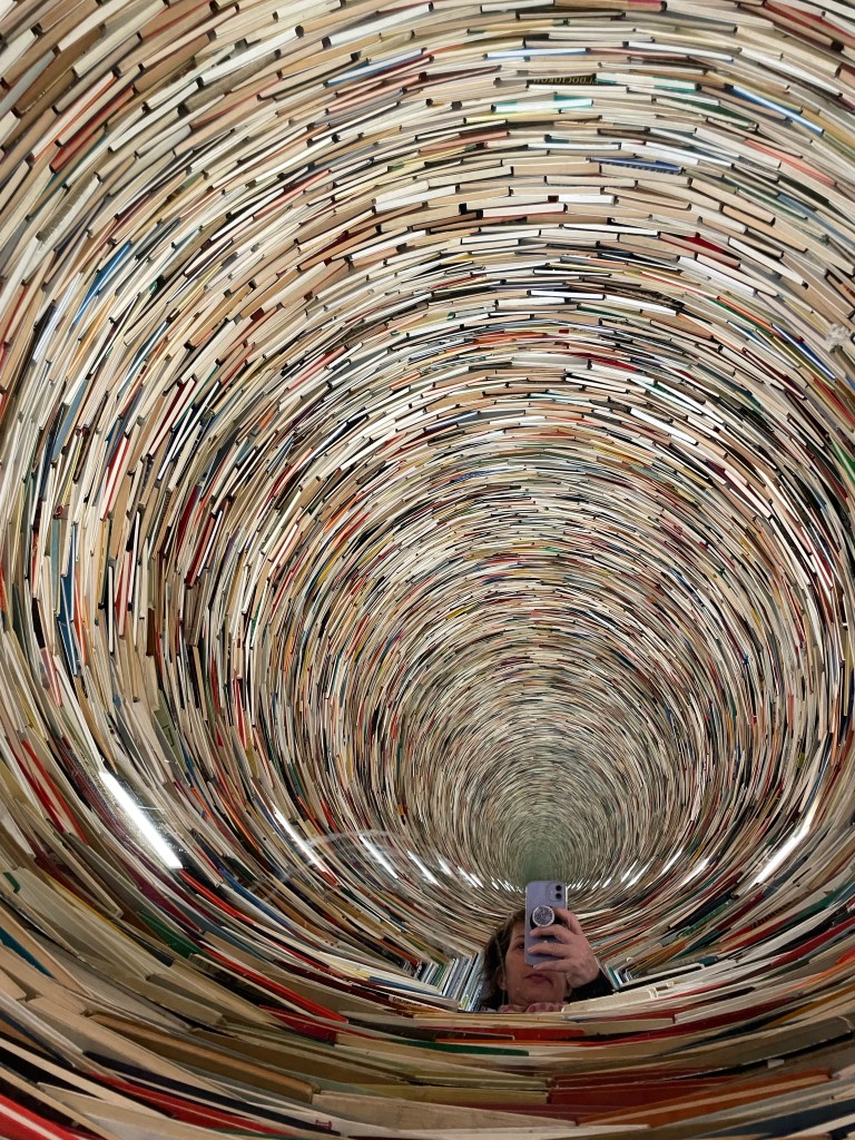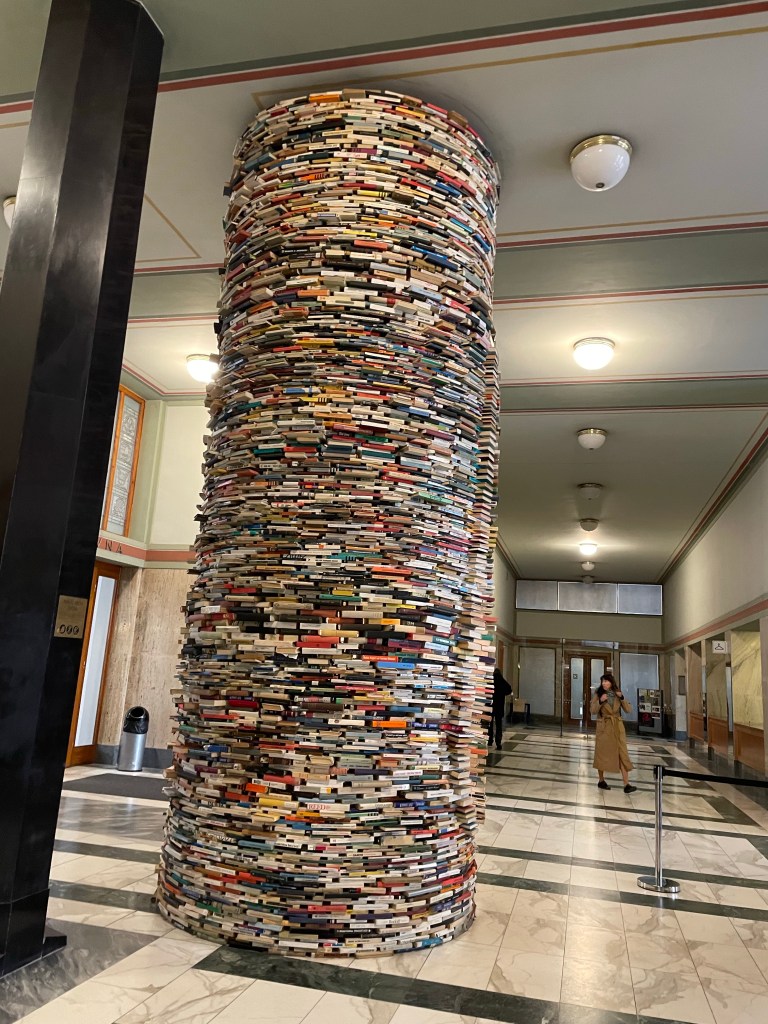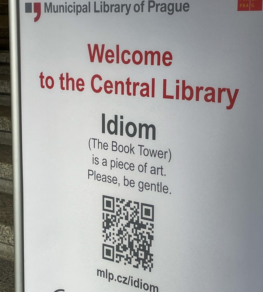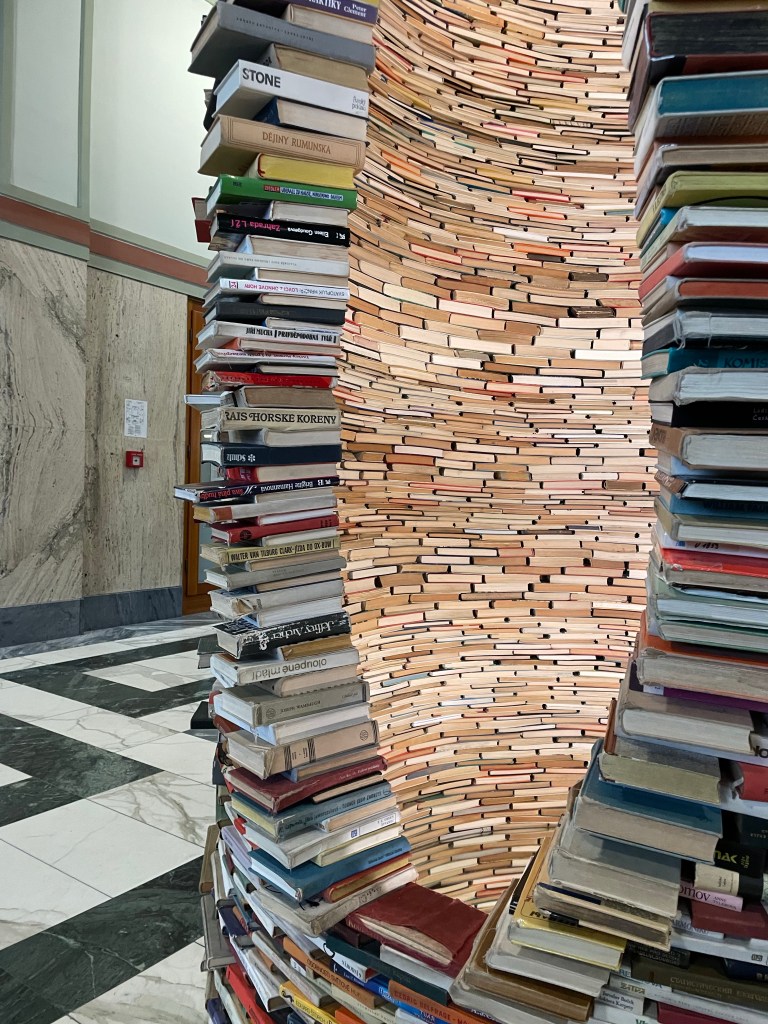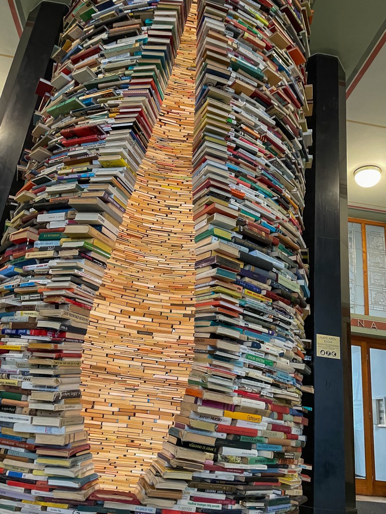 Next it was books. I waited in line to see the Idiom, a book tower at the Prague Municipal Library. It’s a big circular stack of books that people wait in line to see and take pictures with; its a social media thing, per Dana. As far as I’m concerned, people waiting in line to be with books is a good thing. More people should spend more time with books! (Well, the right kind of books. But lets not get into an argument of what constitutes the ‘right kind’ of books; wouldn’t want anyone to think I’m in favor of banning books because I’m definitely not.) If you look inside the stack, they have mirrors that make it appear as if its books for miles. What’s not to love?