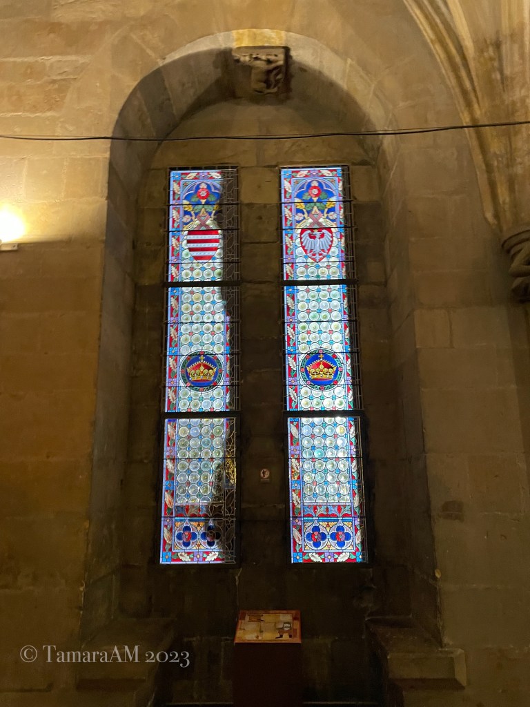 Always love the street lamps in old European cities.One of the stained-glass windows in the cavernous room halfway up the Tower.A view of Tyn Church in Old Town Square.