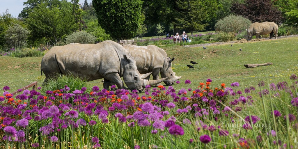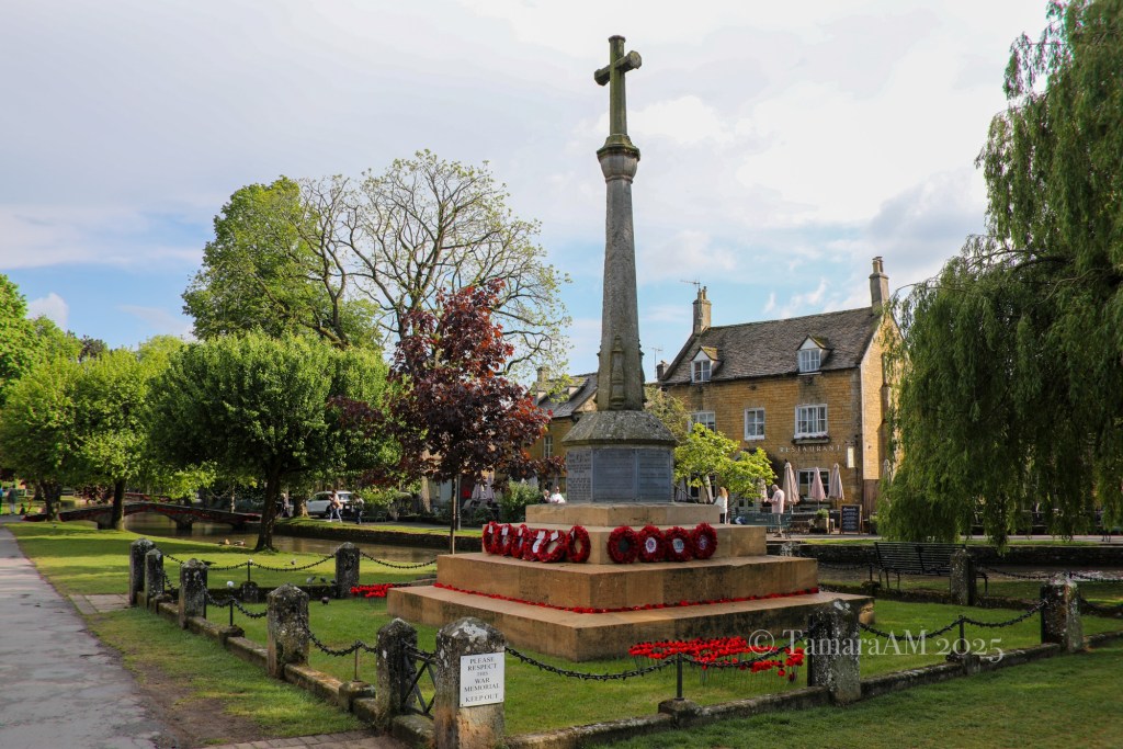 A beautiful purple iris at CWPA beautifully colored bird; I forget the name. In my head is ‘scarlet ibis’ but I’m not certain that’s right, lol. The prairie dogs were darling. If ever there was a ‘what are you looking at? photo, this is it. A beautiful spring day at CWPInside the enclosure with the lemurs; they were energetic, engaging, cuddly… fabulous!The mandarin duck is truly stunning.The German Shepherd and the zebra were both curious about the other; I could only hope the woman holding the Shepherd had a strong enough grip. She didn’t seem very concerned about it, hmmm. A gorgeous purple flower seen throughout the parkThe rhinos in the flowers (well, almost)Two dogs playing in the river that runs through Bourton on the WaterWar memorial in the center of townA quintessential street in the Cotswolds: narrow, with stone houses and charming shops.
