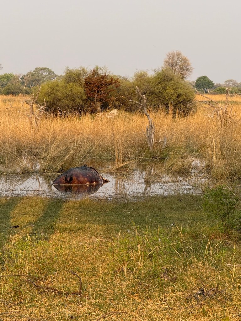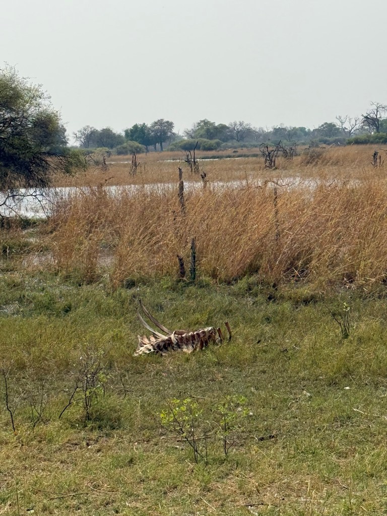 During our morning drive yesterday (Wednesday), we came upon a single black spotted hyena resting in the shade. It was not far past the location of a dead hippo, which, during the course of our visit at Shinde Footsteps, had evolved from dead corpse in the water, to a rotting carcass next to the water, to the focus of vultures, other birds, and hyenas (to name a few), and now, a rack of ribs and a skull.