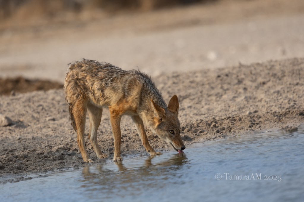 I was pleased, then, to see a beautiful reddish jackal walking up to the watering hole on Friday morning while our group was sitting inside the “bunker”. (The bunker was a hidden seating area directly in front of the watering hole; we could see the animals but we were invisible (ish) to them.)